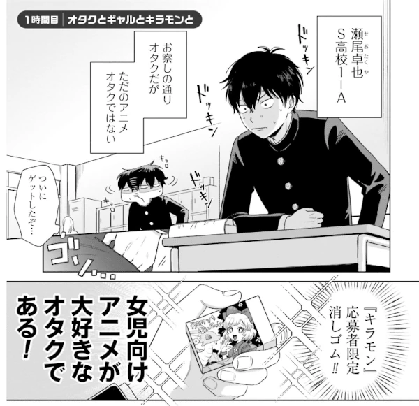This series embodies the recently emerged and much-adored concept in Japan of “gyaru who are kind to otaku.” The protagonist, Seo, is an otaku of girls’ anime—a niche interest that earns him zero social approval and firmly places him in the stereotypical “creepy otaku”(キモオタ) category.